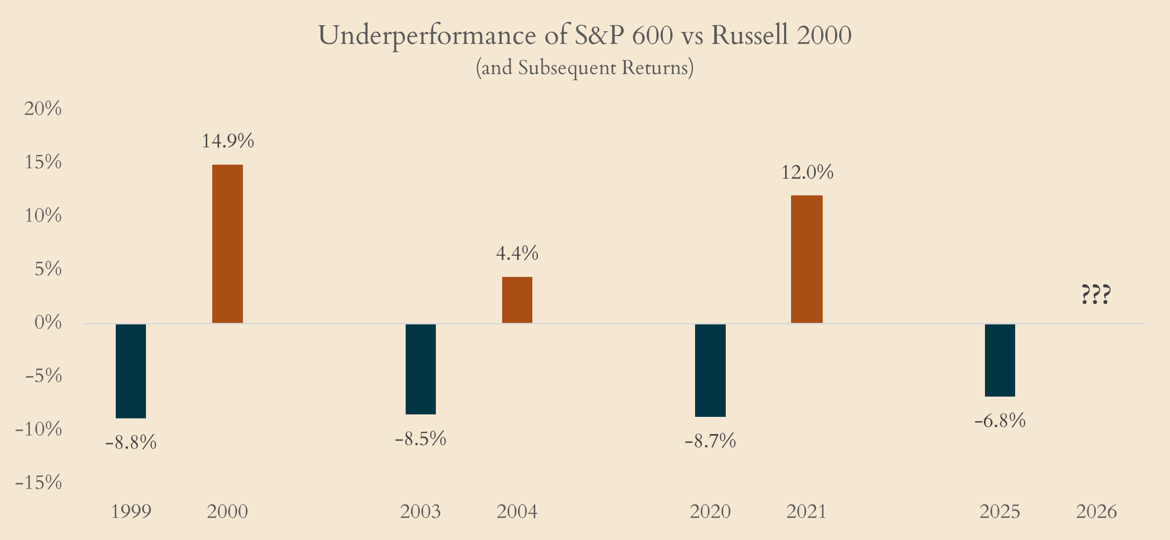 The S&P 600 trailed the Russell 2000 by almost 7% this year, its fourth worst showing ever. All three prior examples were years when the Fed cut interest rates, as they did three times this year. In every subsequent year, the S&P 600 outperformed, often dramatically. I have no idea if 2026 will repeat the pattern, but I wouldn’t be surprised.