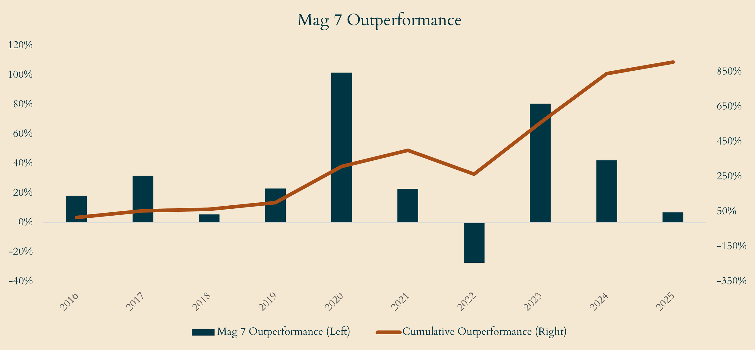 Lastly, in the past 10 years only one investment decision really mattered; how much Magnificent Seven did you own? Consisting of Alphabet, Amazon, Apple, Meta, Microsoft, Nvidia and Tesla, if the answer was some, you probably did fine. If not, your money must be under a mattress.