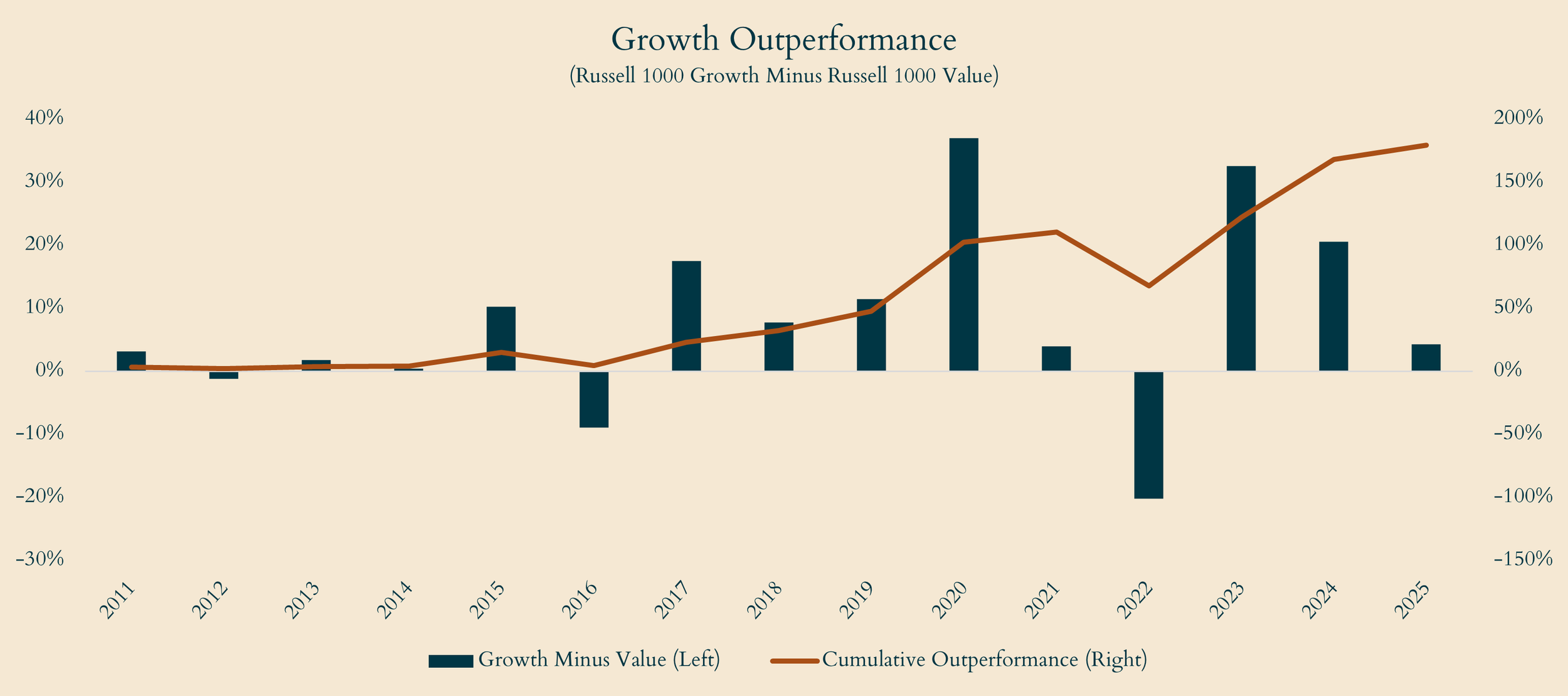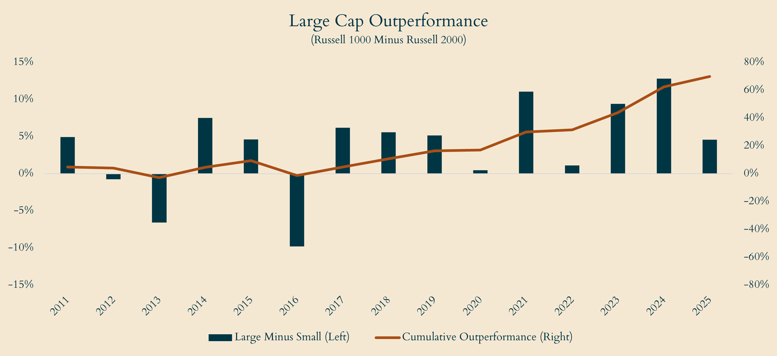 I know those are a lot of pictures to process, but I include them to make a point. Markets are supposed to constantly evolve, trends can’t go on forever and nobody wins all the time. Yet large has consistently beaten small, growth has similarly outperformed value, and the Magnificent Seven have trounced just about everything else.