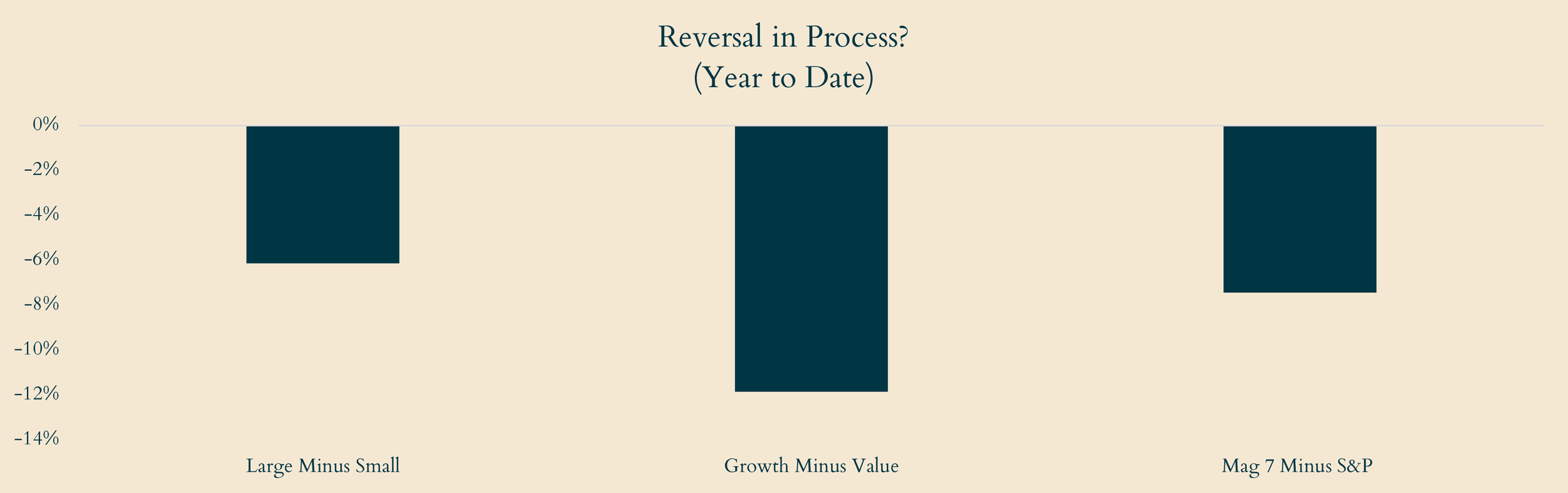 As a small cap manager with a value streak, I’ve avoided making these arguments in the past. Obviously, I’m biased and you’ve heard other contrarians cry wolf long enough. Nor am I suggesting that you shouldn’t own large cap growth or the Magnificent Seven. These are the best companies the world has ever produced and have generated more shareholder value than the other 493 combined. The case I’ve tried to make is that concentration risk is rising and diversification may not always be a drag on performance. It’s worth noting that each of these unstoppable tailwinds recently stopped blowing all at the same time.
